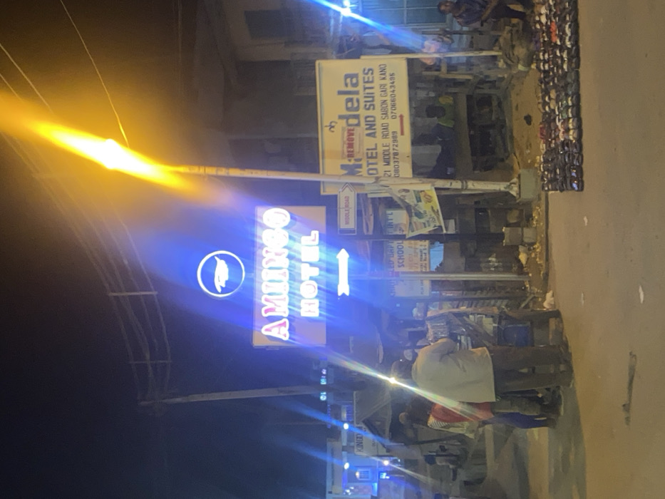 A street scene shows two hotel signs lit up at night. The bottom sign reads "AMIINGO HOTEL" in blue neon, featuring an arrow pointing to the right. Above it, a sign advertises "MiNdela HOTEL AND SUITES" with a street address and phone numbers. Other signs, including one for a school, are partially visible. People are present near the signs, and there are numerous items displayed for sale along the street. A bright yellow street light casts a glare on the scene.