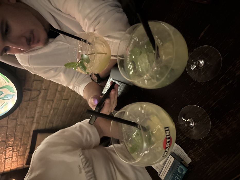 Two individuals are seated at a dark wooden table in a dimly lit indoor establishment, consistent with a bar or pub. The background features a light-brown brick wall and a circular, illuminated sign with a green, stylized leaf motif. Three large, stemmed cocktail glasses are on the table; each contains a light-colored liquid with ice cubes, a lime wedge, a sprig of mint, and a black drinking straw. The glass in the foreground left displays a "MARTINI" logo. A male individual on the right, wearing a white hoodie, has a short beard and is looking down at a black smartphone with a glowing screen, which he holds in his left hand. A watch is visible on his right wrist. A second individual, partially visible on the left, wears a white t-shirt. A pack of "IQOS HEETS" cigarettes and a white paper slip are on the table adjacent to the front-left drink.