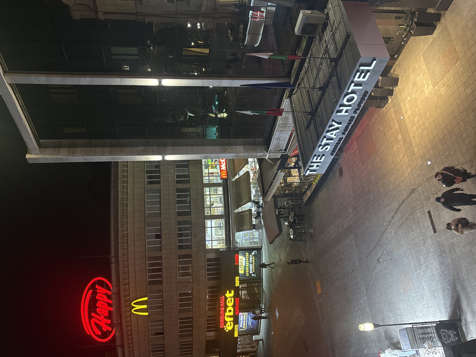 The image captures a nighttime urban scene in Plovdiv, Bulgaria, specifically depicting a section of Central Square. The view is elevated, looking down onto a paved pedestrian plaza illuminated by artificial light sources. To the right, a multi-story, modern building with a dark, reflective glass facade is prominent. Its ground level features "THE STAY HOTEL CENTRAL SQUARE PLOVDIV" in illuminated white lettering on a grey canopy. Two Bulgarian flags (white, green, red horizontal stripes) and one European Union flag (blue with yellow stars) are displayed on flagpoles above the hotel entrance. An air conditioning unit is mounted on the canopy. To the left, an older, multi-story building with a lighter-toned facade features multiple windows. A large red neon sign spelling "Happy" is visible on its rooftop. Below it, a yellow "McDonald's" arch logo is affixed to an upper floor. At ground level, this building houses a "Gambling Hall efbet" with illuminated signage, adjacent to a McDonald's entrance. Various other storefronts with illuminated interiors and awnings are present along the building's base. The pedestrian square is paved with light-colored block pavers. Approximately ten to twelve individuals are present across the square. In the lower foreground, three people are walking away from the viewer. Other individuals are seen walking in various directions or standing near establishments. Several individuals are seated at outdoor tables under a dark awning positioned centrally in the square. A street lamp with a yellow glow is visible in the lower-left corner of the frame.