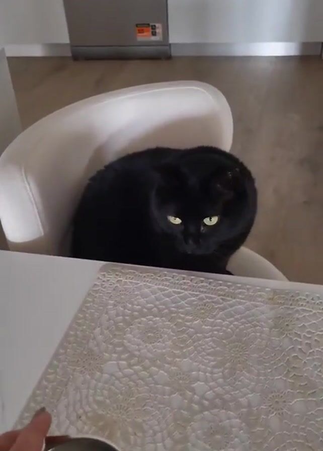 black cat sitting in a white chair at a white table with a decorative placemat. A person's hand places a small, stainless-steel bowl of white liquid on the table in front of the cat. The cat looks at the bowl. In the background, there is a stainless-steel dishwasher and light-colored wooden flooring.