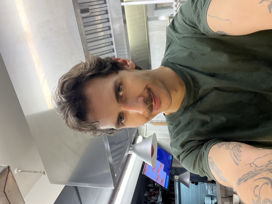 A male individual with dark, wavy hair and a mustache smiles subtly directly at the camera. He wears a dark green crew-neck t-shirt. Tattoos, including a winged figure, are visible on his left forearm. The subject is positioned within a professional kitchen or restaurant back-of-house area. Overhead, multiple stainless steel exhaust hoods are visible, one being a rectangular panel suspended by hooks, and another a vented hood with grates. Several conical pendant lights and linear light fixtures illuminate the scene. In the left background, a tilted monitor displays a digital interface with a blue background and segmented red and blue squares, suggestive of an order management system. Below the monitor, shelves stocked with bottles and stacked white plates are visible, indicating a service or bar area. Other stainless steel surfaces and kitchen equipment are present in the background. The specific location within Budva, Montenegro, cannot be determined from the image.
