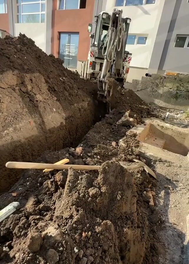 A small excavator is digging a trench next to a building on a sunny day. The excavator, painted white and gray, is positioned on a mound of dirt parallel to the trench it is digging. The operator, visible in the excavator's cabin, is moving the arm and bucket to scoop dirt from the trench and deposit it onto the surrounding soil. A shovel and pick are lying on a mound of dirt in the foreground, next to some construction debris. The building in the background is multi-storied with large windows and a light gray and reddish-brown exterior. The sky is clear and blue.