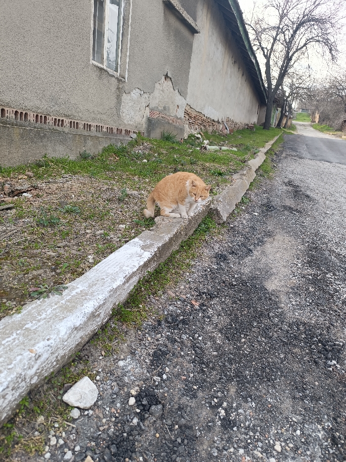 An orange and white cat is depicted in a squatting position on a concrete curb in Cherkovitsa, Bulgaria
