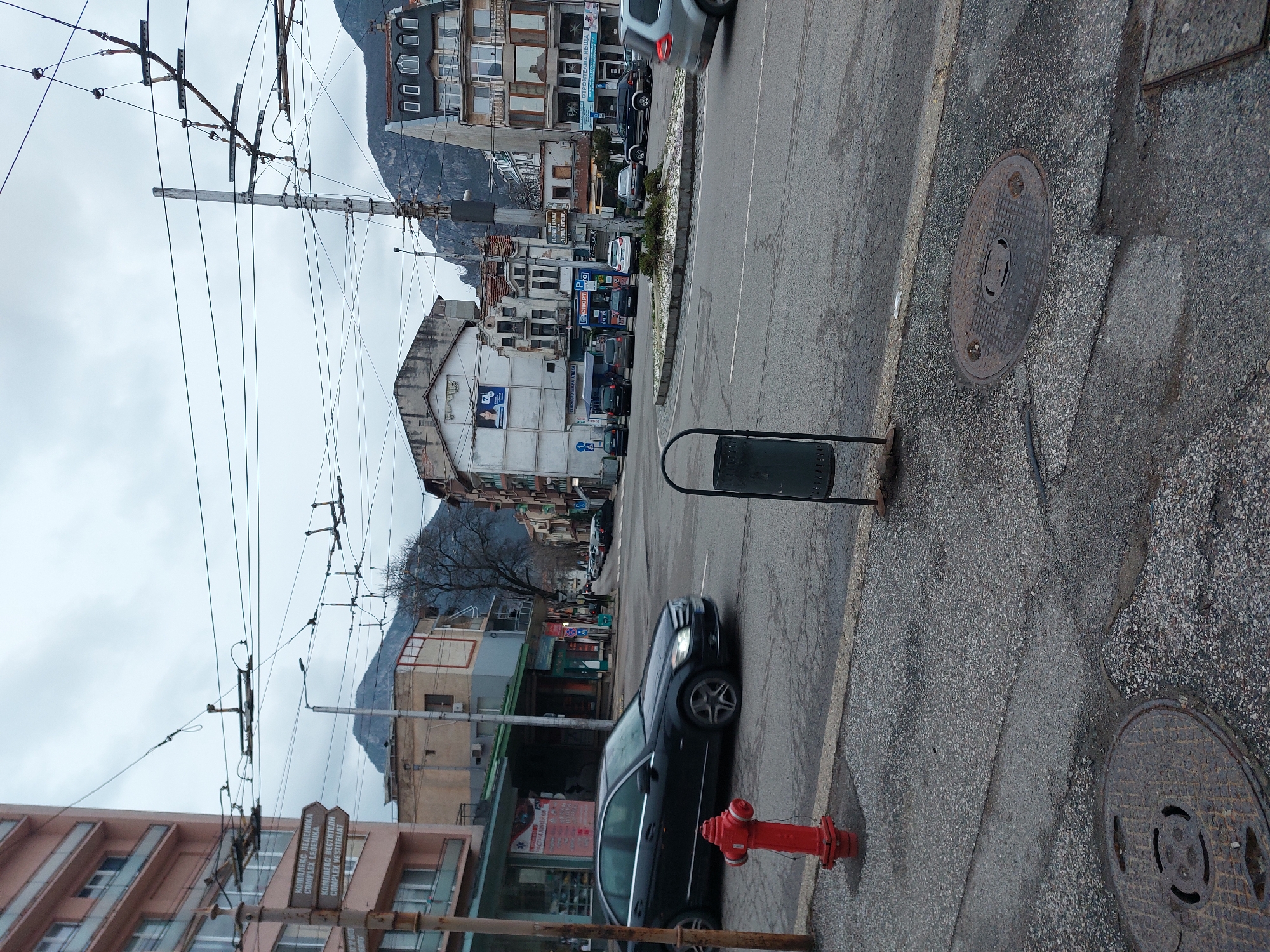 The image depicts a street scene in Vratsa, Bulgaria. The view is looking down the street, which is lined with buildings of varying heights and architectural styles. A car is driving on the road, and a bright red fire hydrant is on the sidewalk. Manhole covers can be seen on the street and sidewalk. Overhead, there are complex networks of utility lines. The sky is overcast. Street signs indicate directions to "COMPLEX LEDENIKA" and "COMPLEX VESTITELIAT." In the background, a mountain range is visible.