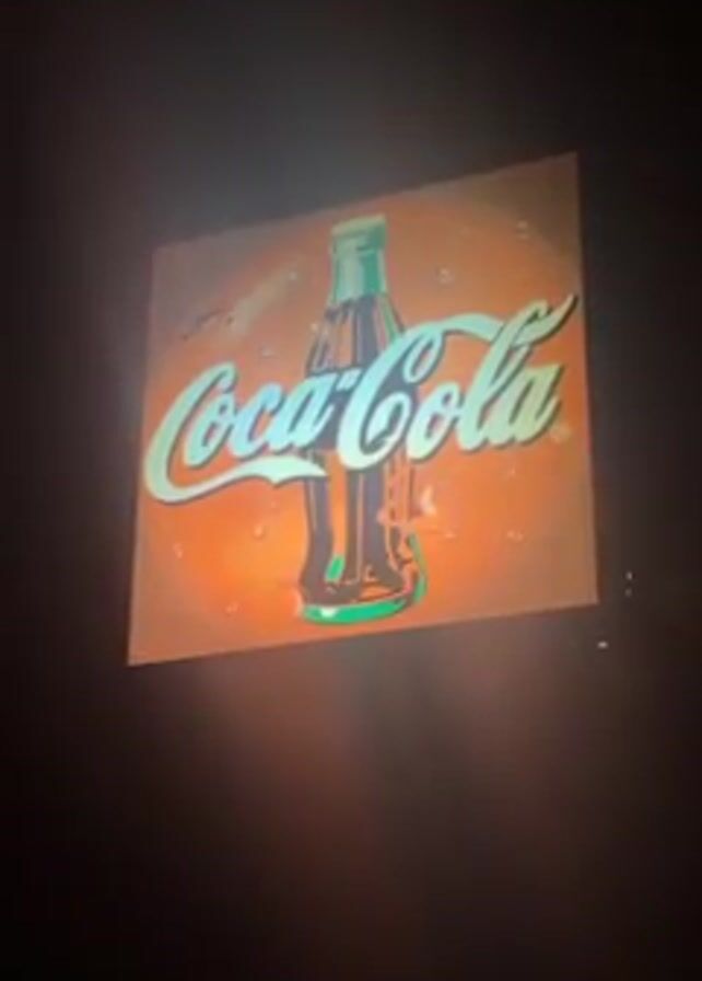 A video shows a Coca-Cola advertisement projected onto a dark surface
