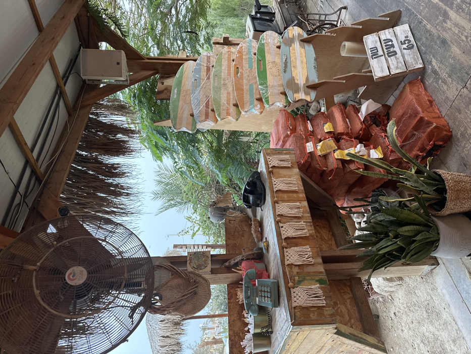An open-air shop displays various items. Surfboards, wrapped in plastic, lean against a wooden shelf. Below, vintage telephones and macrame hang on a rustic wooden counter. Bundles of firewood sit beside potted snake plants. A large fan hangs overhead, and natural light streams through the open space. A white speaker is mounted on the roof frame.