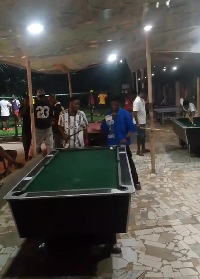 Here's a detailed description of the video: Setting: The video is taken in an outdoor recreational area, likely in the evening, under a semi-covered structure supported by wooden pillars. Overhead lighting is provided by several circular lights attached to the roof. People: Several people are present. Two men stand at the pool table; one in a white and black striped Juventus jersey and the other in a blue shirt. A group of people stands around the pool table, casually watching. Other people are visible in the background, some near a second pool table and others near a ping pong table. Objects: The primary object is a black pool table with a green surface. Pool balls are on the table, and the man in the blue shirt is holding a pool cue. In the background, there's another pool table and a ping pong table. The ground is paved with a mosaic of light and dark-colored tiles. Actions and Interactions: The man in the blue shirt is preparing to take a shot at the pool table. He is holding a pool cue and aiming. The man in the Juventus jersey is standing beside him, possibly observing or giving advice. Others are casually watching the game. Environment: The area is open with some surrounding greenery in the background, indicating an outdoor or semi-outdoor location. The atmosphere appears relaxed and social, suggesting a recreational setting.