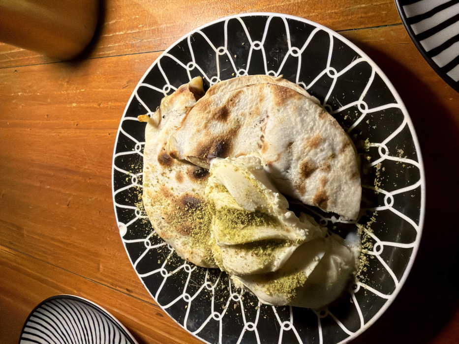 A plate with a geometric pattern shows two pieces of flatbread with golden-brown spots. Adjacent to the bread is a creamy, layered dessert, possibly ice cream or a whipped dairy product, sprinkled with green pistachio crumbs. The plate sits on a wooden table, with a partial view of what appears to be a glass or container at the top left, and a second plate with a striped pattern at the bottom left.