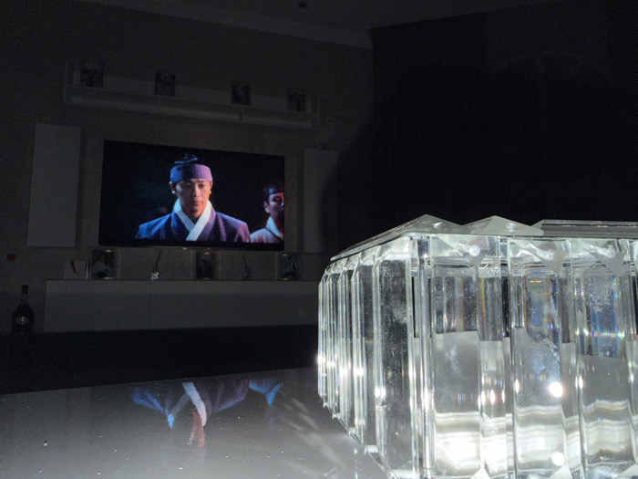 A dark room features a television playing a scene with two Korean men in period attire. Below the TV, a long white cabinet holds various small items. To the right and in the foreground is a crystal box. The scene from the television reflects off the surface on which the box sits. The room has dark walls and minimal lighting, creating a somber atmosphere.