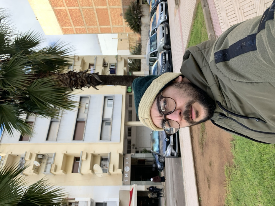 The image presents an urban street scene in Meknes, Morocco, under an overcast sky. In the immediate foreground, a male individual with a dark beard and eyeglasses, wearing a dark green hooded jacket and a green and beige knit beanie, is positioned centrally, directly facing the camera. He stands on a patch of green grass and reddish-brown earth. Behind the individual, a paved street runs horizontally, featuring a line of parked vehicles, including a silver Renault SUV and several other cars, some appearing to be silver taxis. To the left, a multi-story building, partially painted in light yellow and light blue, features multiple balconies with satellite dishes. A ground-floor establishment on this building displays a sign with the text "SMOKA." Several pedestrians are visible on the sidewalk in front of this building. A tall palm tree rises centrally from the midground, its trunk partially obscured by the foreground subject, extending towards the top of the frame. To the right, another multi-story building with a reddish-brown facade is visible in the background.