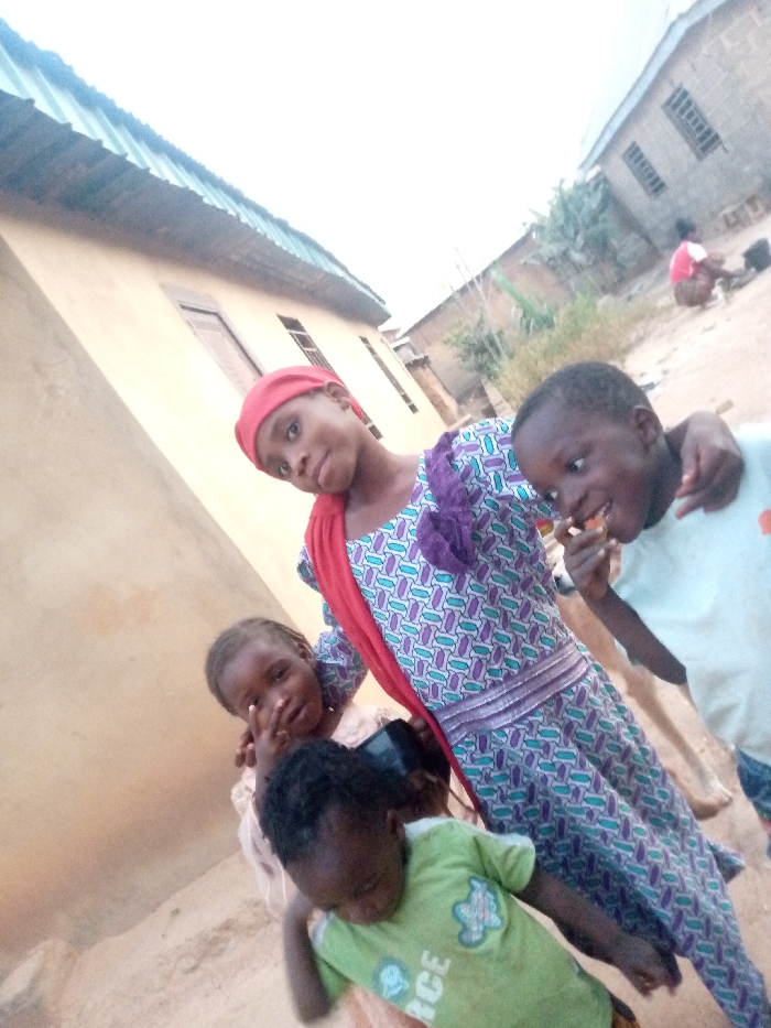 Four children pose outdoors near a building. One, wearing a blue and white patterned dress with a red headscarf, looks directly at the camera. A boy beside her has his arm around her shoulder. Another child, wearing a green shirt, looks downward. In the background, a person sits on the ground near another building. The lighting is bright.