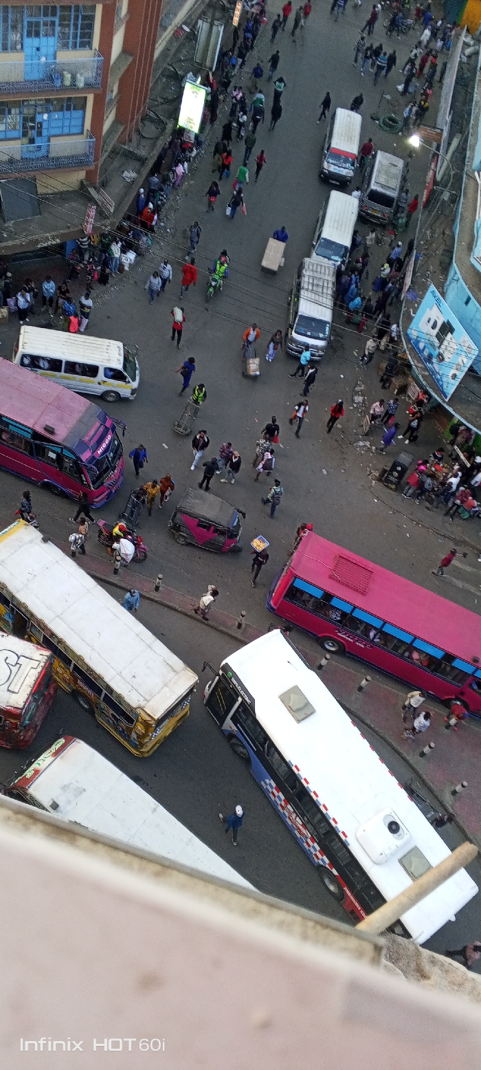 The image displays an elevated view of a congested urban street in Nairobi, Kenya