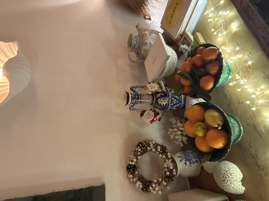 A wall with a sconce and several objects on a surface. A teapot, a white box, and a blue and white vase with Santa Claus figurines are among the items. Two green bowls overflowing with oranges and lemons sit next to a coral wreath, coral, and a blue and white pot. Behind these, fairy lights are displayed. The objects suggest a festive holiday decoration arrangement.