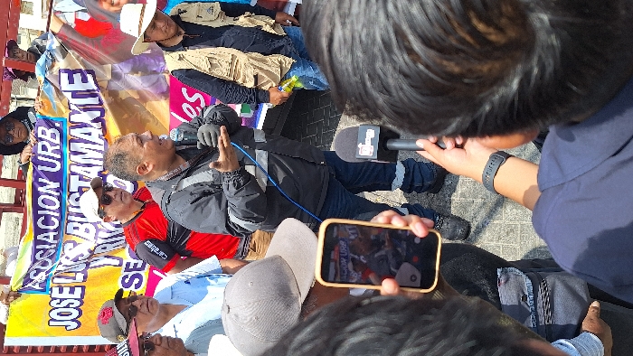 The image captures an outdoor public gathering in Miraflores, Peru. A man, centrally positioned, wears a dark grey jacket with reflective silver strips on the sleeves and waist, blue jeans, and dark boots. He is actively speaking into a black wired microphone held in his gloved left hand, while gesturing with his right. Behind him to the left, several men are visible; one wears a light blue shirt and a baseball cap, another a red and black shirt with "carab" partially visible, a white baseball cap, and sunglasses. To the speaker's right, a man in a light-colored fedora-style hat and a tan multi-pocket vest holds a yellow bottle. In the upper background, behind a red metal barrier, several individuals hold a large yellow and white banner with prominent blue and purple text, partially readable as "ASOCIACION URB. JOSE LUIS BUSTAMANTE Y R." In the immediate foreground, from an overhead perspective, a person holds a gold-cased smartphone vertically, recording the event, with the phone screen reflecting the central speaker. Adjacent to this, another person holds a black microphone with a white "La Resistencia" (or similar stylized 'R') logo towards the speaker. This person wears a dark blue shirt and a dark fitness tracker on their left wrist. The gathering occurs on a pavement of square grey tiles, under bright daylight.