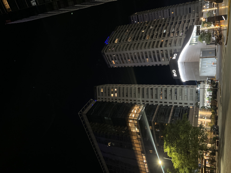 tall buildings at night. One building is made of glass and has visible light inside. Another building has "CHE" written on it with light. There is also a street, trees, and light poles with glowing light. The overall scene is illuminated by artificial lights. The image appears to be taken from below, angled upwards.