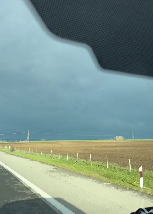 The video, recorded from the inside of a moving vehicle, presents a view of a flat, rural landscape under a heavy, overcast sky