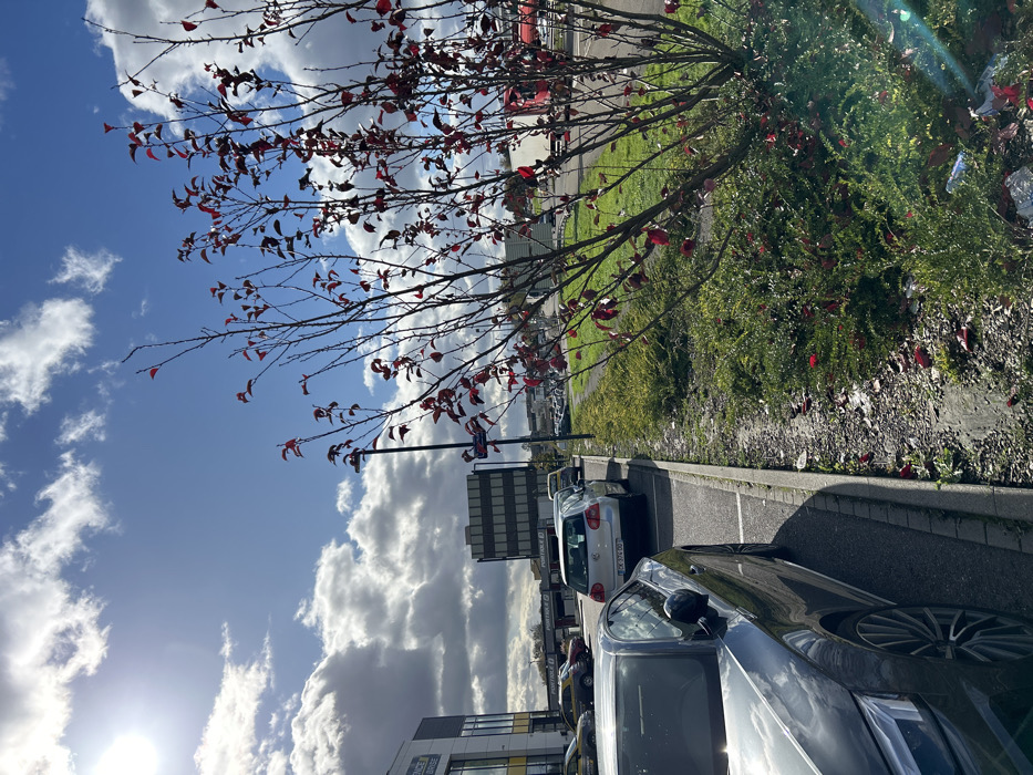 The image depicts an outdoor commercial or industrial park area on a sunny day with scattered clouds in Fegersheim, France. The specific location is identified by visible signage as the vicinity of "RÉSIDENCE BRYSE" and "PORTIQUE" establishments, suggesting 1 Rue de l'Europe, 67640 Fegersheim. In the foreground, to the left, the front driver's side of a dark-colored sedan, likely an Audi, is parked parallel to a paved curb. To the right, a multi-stemmed deciduous shrub with mostly bare branches and clusters of small, deep reddish-brown leaves occupies a grassy verge, interspersed with smaller green ground cover. Scattered reddish leaves and some white litter are visible on the ground within the verge. The midground features a paved parking area with several vehicles parked parallel to the curb. Directly behind the foreground sedan is a silver Volkswagen Golf with French license plate "DK-374-DQ". Further down the parking lane, additional cars are visible. A black streetlamp pole with an obscured blue street sign is situated behind the central shrubbery. Beyond the parking lane and verge, a larger paved area contains numerous parked vehicles, including a white semi-trailer truck to the right. The background on the left shows a modern building with light-colored panels and dark-framed windows, bearing partial signage "RÉSIDENCE BRYSE." In the center-background, a dark, multi-storied building with horizontal bands is visible. Other low-rise commercial or industrial structures are present further in the background. The sky is bright blue with scattered white cumulus clouds, and the sun, positioned in the upper-left, casts strong light, creating a lens flare and distinct shadows. No individuals are present in the scene.