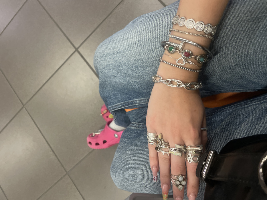 The image presents a close-up, first-person perspective of a seated individual. The person's lower torso and legs are covered by light blue denim jeans. Their feet are clad in bright pink Crocs, adorned with various colorful jibbitz charms, worn over white socks. The floor is composed of light gray tiles with darker grout lines, indicating an indoor environment. The person's left hand and forearm are prominently featured, heavily accessorized. The fingernails exhibit a multi-colored, patterned manicure. The hand wears numerous silver-toned rings on multiple fingers; these rings incorporate design elements such as amber-like stones, opalescent stones, and intricate geometric or abstract patterns. The left wrist and forearm are adorned with a stack of bracelets: a thick silver chain-link bracelet, a delicate silver chain with a heart charm, several charm bracelets set with green, red, and turquoise circular stones, a plain silver bangle, and a wider silver bracelet featuring circular motifs encrusted with clear stones. The exact location within Kempton Park, South Africa, is not visually discernible from the details provided in the image; however, the tiled flooring suggests a public or commercial indoor setting.