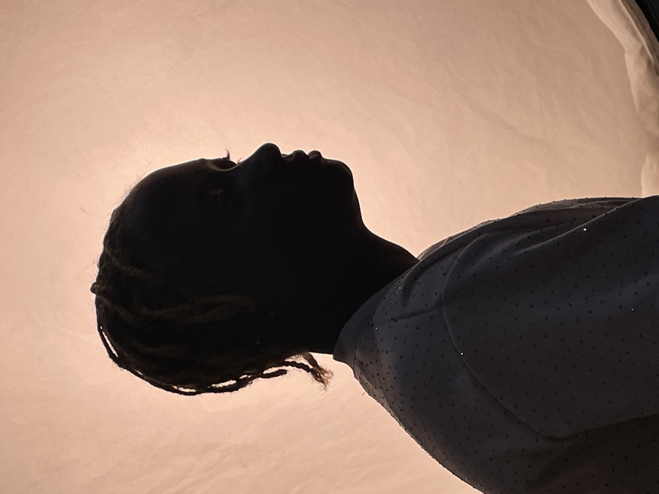 The image displays the left profile of an individual, from the upper torso upwards, against a plain, evenly lit, light reddish-orange background. The scene is located in Barakin Akawo, Nigeria. The subject is rendered in deep silhouette due to strong backlighting, obscuring most facial features, though the distinct profile of the nose, lips, and chin is visible. The individual has hair styled in dreadlocks or thick braids. They are wearing a light-colored, long-sleeved garment, possibly grey or off-white, which is textured with numerous small, reflective, raised dots or embellishments, particularly visible on the left shoulder and upper arm. The individual is static, with no overt action or interaction depicted within the frame.