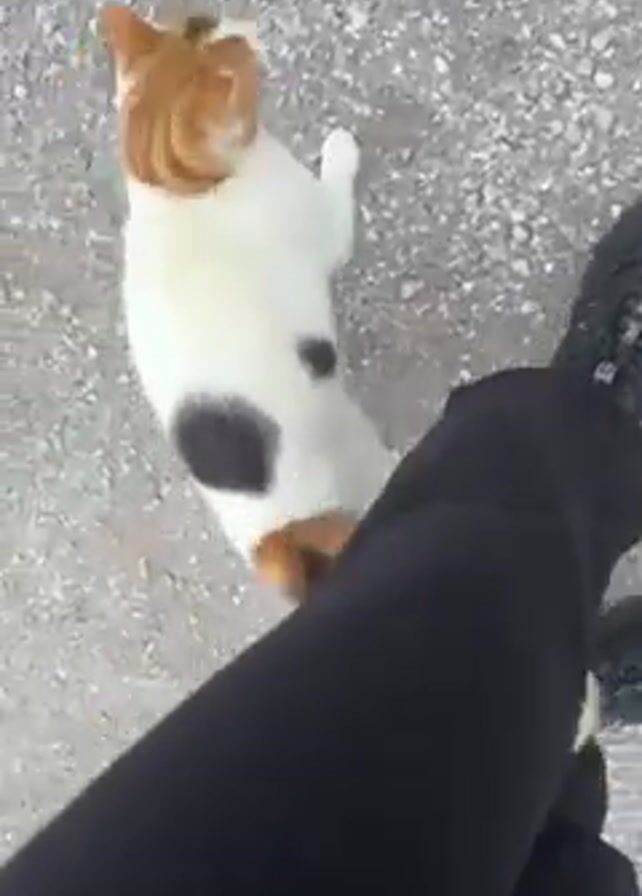 person standing on a gravelly surface with patches of snow. The person is wearing black shoes and black pants. A calico cat approaches the person and rubs against their legs. The cat is white with patches of orange, black, and brown. The video is shot from a high angle, looking down at the person and the cat.