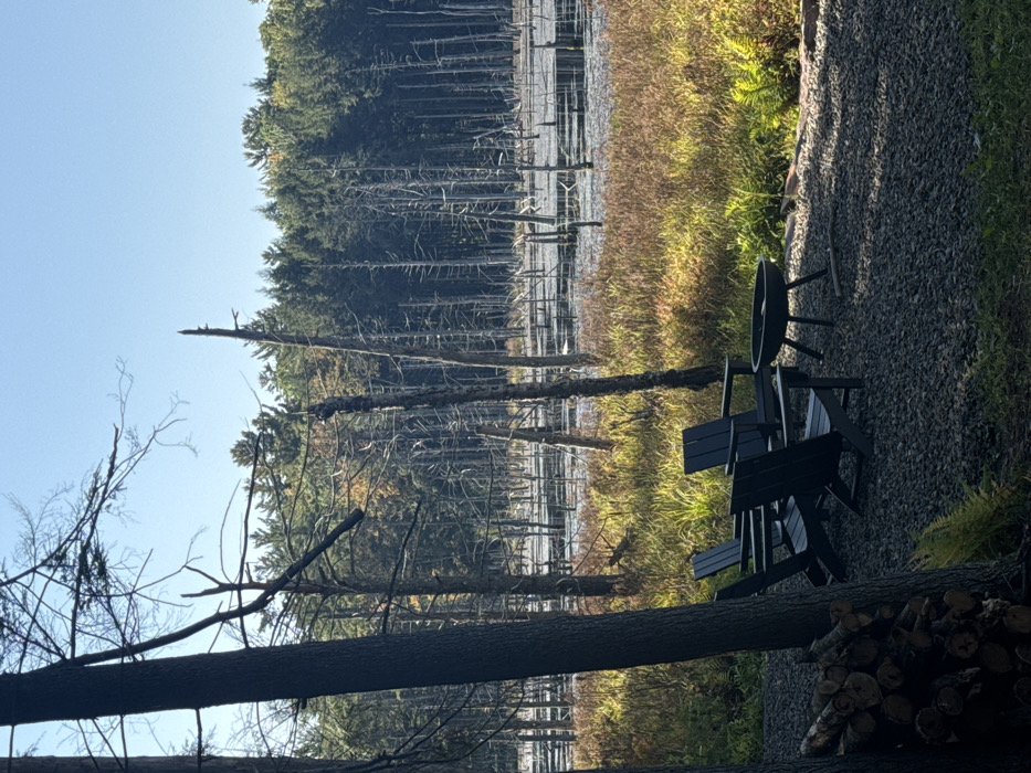 This image depicts an outdoor recreational area in Otego, United States, overlooking a marshland. In the foreground, a stack of cut firewood logs is visible on the far left. Adjacent to this, a gravel-covered ground features a seating arrangement consisting of four dark-colored Adirondack-style chairs positioned around a circular, black metal fire pit. No individuals are present. The midground is dominated by a marsh or swamp, characterized by standing water reflecting the sky, numerous skeletal, barkless dead trees, and patches of tall, dry, yellowish-brown grass. Some green ferns are interspersed among the dry vegetation. The background features a dense forest of dark green coniferous trees, extending to the horizon under a clear, bright blue sky. The scene is illuminated by natural sunlight, casting shadows.