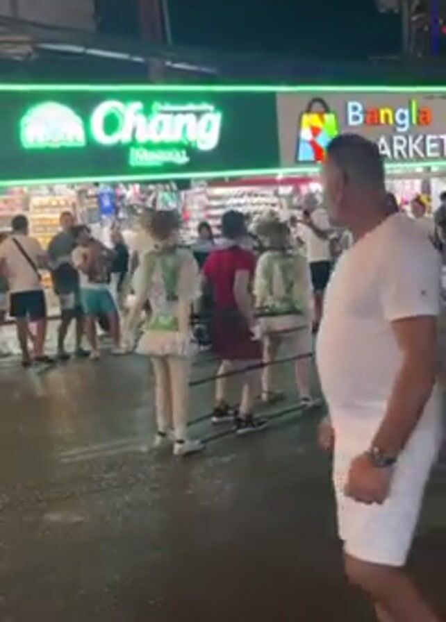 The video depicts a bustling street scene at night, likely in a tourist area, as indicated by the Bangla Market signage and various onlookers