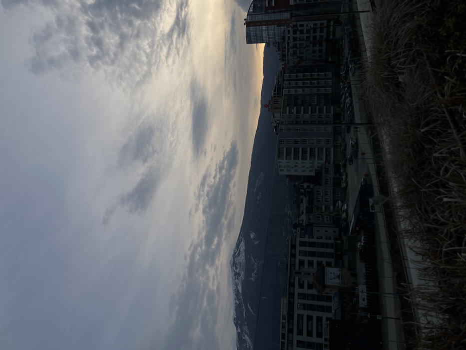 An elevated panoramic view captures a cityscape in Sofia, Bulgaria, at dusk or dawn, with Vitosha Mountain dominating the background. The sky above is overcast with a blend of cirrus and stratocumulus clouds, appearing grey-blue, transitioning to a warmer, light orange hue on the far right horizon, indicative of ambient sunlight near the horizon. In the background, the silhouette of Vitosha Mountain is prominent, its upper slopes covered in patches of snow, contrasting with the dark, forested lower sections. Below the mountain, the urban landscape unfolds. Numerous multi-story residential and commercial buildings, primarily constructed from concrete and glass, vary in height and architectural style. A prominent building in the mid-right features a red "BLEND" sign near its roofline. Further right, a taller, modern building with a glass facade reflects the subdued light. Several open-air parking lots are visible between the structures, containing dozens of parked vehicles, mostly cars, suggesting active urban areas. Two indistinct human figures are discernible walking on a paved surface within one of these parking areas in the mid-ground. The immediate foreground consists of dry, dormant grasses and weeds, dark and matted, obscuring the lowest portion of the scene. A dark, low-lying barrier or wall separates this vegetation from the urban developments. A thin, dark cable or wire traverses horizontally across the lower middle section of the image, positioned between the foreground vegetation and the city structures. The overall lighting is dim, suggesting low light conditions.