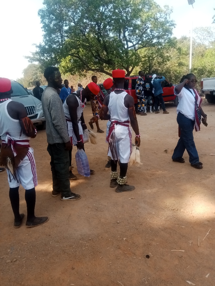 The image displays an outdoor gathering on unpaved, light brown earth, situated in Jos, Nigeria. The scene is set during daylight hours under a bright sky, with a large, leafy green tree prominent in the central background, surrounded by other sparse vegetation. In the foreground, from left to right, three male individuals are observed. The leftmost individual is seen from behind, wearing a white sleeveless top, white shorts with purple side stripes, black leg coverings, and dark shoes. He wears a red cap, a red and white beaded necklace, brown armbands, and a brown fur or hide garment attached at the waist. Immediately to his right, a male subject faces right, attired in a grey long-sleeved shirt, dark green cargo pants, and dark sneakers with white accents. His face shows dark markings. Further right, a third male individual, dressed in a white sleeveless top, white shorts, a red cap, and a beaded necklace, is bent forward, holding a translucent blue plastic bag. To his right, another male individual stands facing away from the camera, also in white traditional attire, a red cap, and a beaded necklace. His white shorts are trimmed with red and white fabric, and his black leg coverings are adorned with light-colored shell or bead anklets. He holds two white, whisk-like objects. In the mid-ground, a female individual walks from right to left, wearing a white t-shirt, blue jeans, dark shoes, and sunglasses. A red and white patterned cloth is draped over her left shoulder. Her right hand is positioned near her ear. The background reveals several parked vehicles, including a silver SUV on the far left, a red car in the mid-right, and a partial view of a white pickup truck on the far right. A group of individuals, some in patterned clothing and blue shirts, are congregated near these vehicles. A white pole extends vertically on the far right of the frame.