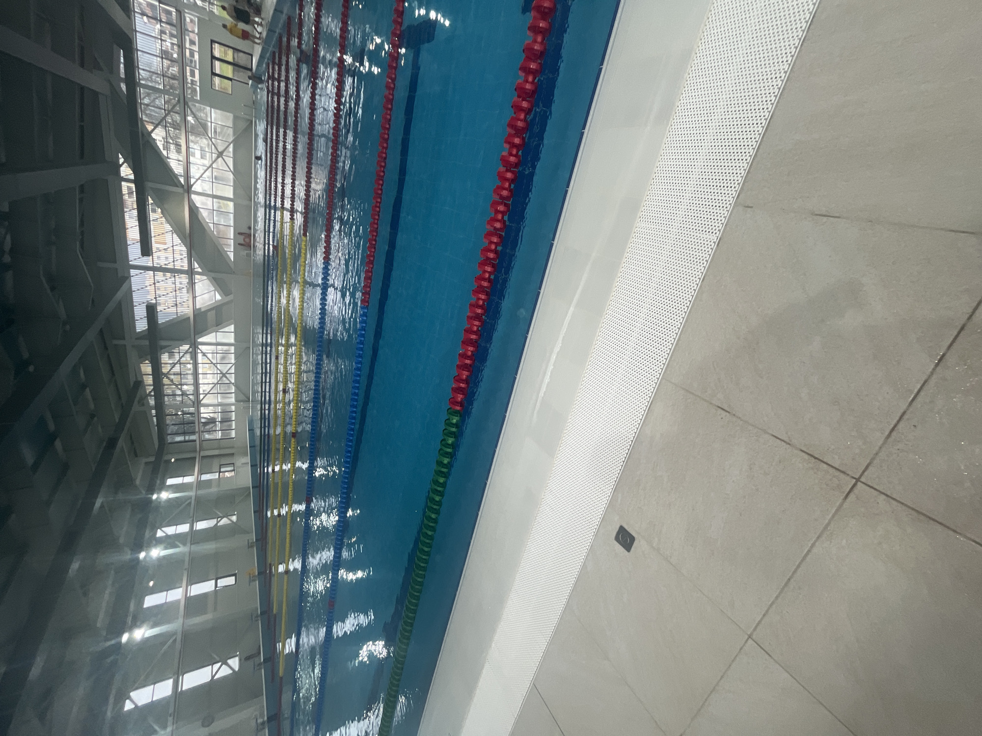 The image depicts the interior of a modern indoor swimming pool facility located in Shumen, Bulgaria. The primary subject is a large, rectangular swimming pool filled with clear blue water, segmented into multiple lanes by buoyant lane ropes in red, blue, green, and yellow. The pool's edge features a white coping and a continuous white perforated grate system. The surrounding floor is covered with large, light grey square tiles, with a dark square drain cover visible in the foreground. The facility's architecture includes a high ceiling with exposed metal structural beams and numerous linear artificial light fixtures. The left wall incorporates a series of tall, narrow vertical windows, allowing natural light to enter. The far wall features a expansive glass facade with visible external residential structures and trees. A set of double doors is visible on the far right. Several individuals are present. Multiple figures are partially submerged in the pool, engaged in swimming or standing. Near the double doors on the far right, two individuals stand outside the pool; one wears a yellow top and appears to be holding a red flotation device, indicative of a lifeguard.