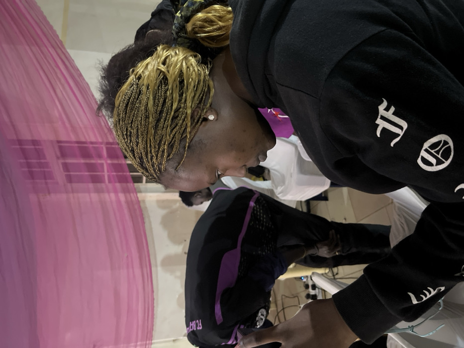 A tan-skinned person with blonde braided hair and a small stud earring looks down, obscured by a black hoodie with white symbols on the sleeve. A second person, wearing a black shirt with purple accents, is visible in the background. A pink curtain hangs to the left, adding color to the scene. The setting appears to be indoors, with a floor and possibly furniture in the background.