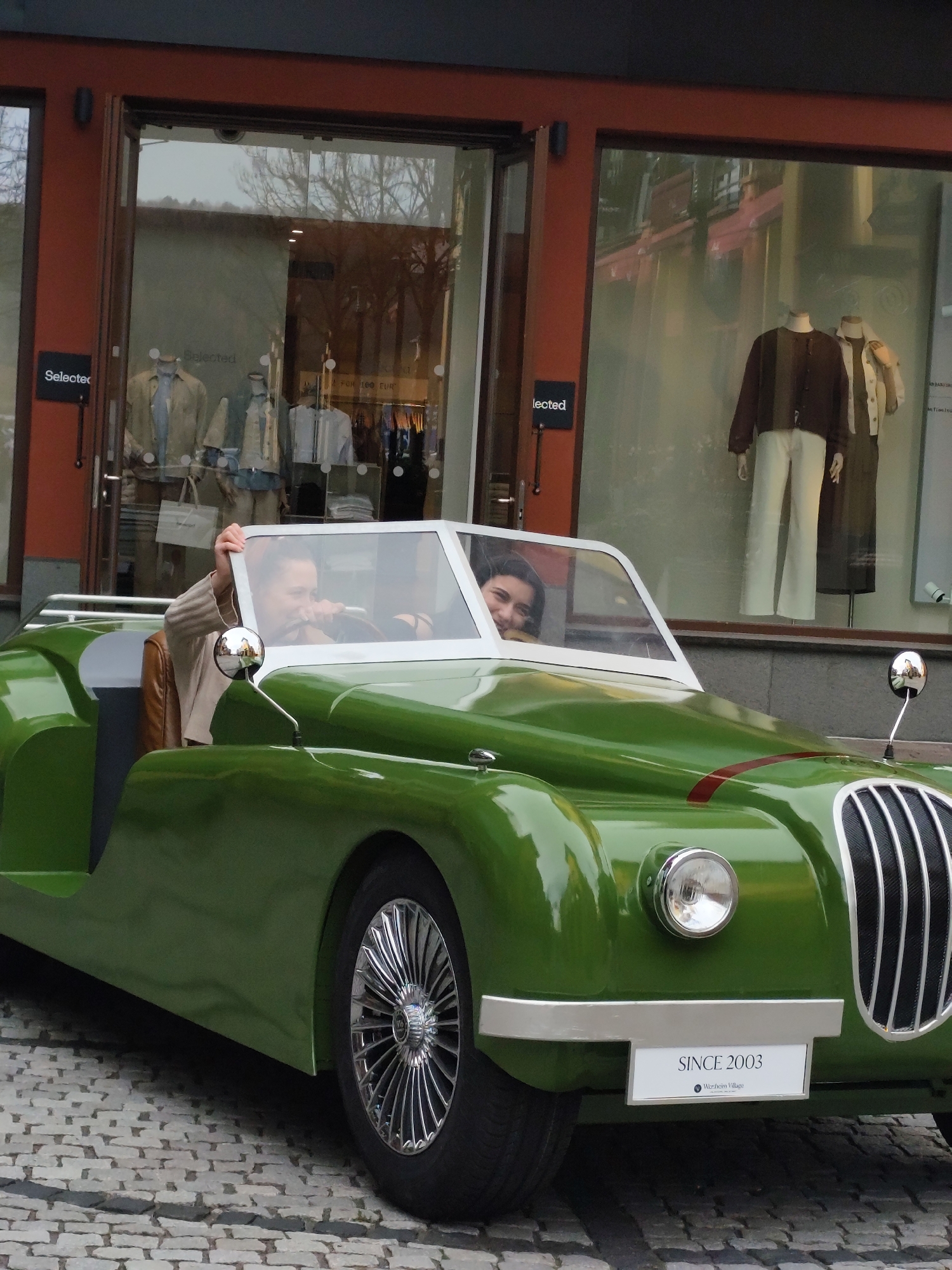 A glossy green vintage-style convertible car with a white windshield frame is parked on a cobblestone street in front of a retail store at Wertheim Village, Wertheim, Germany. The car features a chrome grille, a single chrome circular headlight visible on the right front, a chrome front bumper, and multi-spoke chrome wheels. A white rectangular sign below the front bumper reads "SINCE 2003" and "Wertheim Village." Two individuals are seated inside the car. The person in the driver's seat, wearing a light-colored top and a brown jacket, holds the upper frame of the windshield with their left hand and looks towards the right. The passenger, seated on the right, has dark hair and smiles, looking directly forward. The background consists of a storefront with large glass display windows framed in red-brown. Black "Selected" brand signs are visible on the store facade. Mannequins displaying various clothing items, including jackets and trousers, are visible inside the store windows, which also reflect trees and overhead structures.