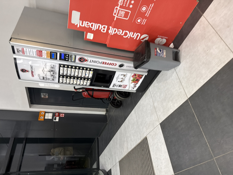 The scene depicts an interior area, likely a lobby or corridor, in a commercial or public building in Targovishte, Bulgaria. The floor is composed of alternating dark gray and light gray rectangular tiles, with a dark gray ribbed mat positioned near a revolving glass entrance door on the left. Reflected in the glass door, a person wearing a light-colored jacket is partially visible, appearing to look down, possibly at a handheld device. Adjacent to the glass door, on a dark gray wall panel, are multiple electrical boxes, a red fire alarm pull station, and various controls. In the mid-ground, a dark gray door marked with a white "WC" sign for a restroom is visible. A red wheeled fire extinguisher is positioned against the wall to the left of the "WC" door. To the right, a silver and white "COFFEEPOINT" vending machine, featuring numerous product selection buttons, a digital display, and graphics of coffee and fruit, stands prominently. A small, gray plastic trash bin with a black lid is located on the floor in front of the vending machine. Further to the right, several large, red advertising panels for "UniCredit Bulbank," displaying banking graphics, QR codes, and Mastercard logos, are stacked or leaning against the wall.