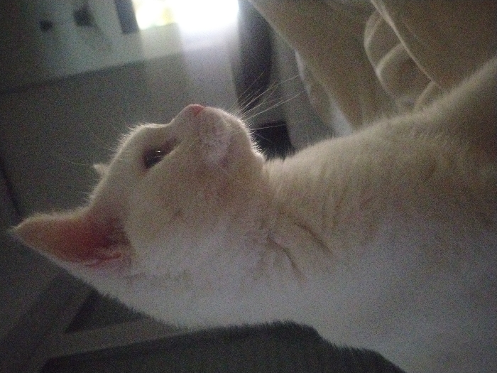 A cream-colored cat faces upward, its head tilted back. The nose is pink, and the fur appears soft and fluffy. The cat's ear is visible in the lower left corner of the image. A window and indistinct shapes are visible in the background, suggesting an indoor setting. The overall lighting creates a bright glow.