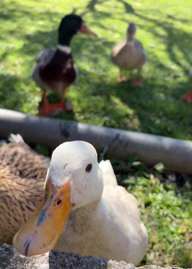 group of ducks in a grassy area. In the foreground, a white duck with an orange beak is peering at the camera from behind a concrete edge. Behind it and to the left, another duck with brown plumage is partly visible. In the background, three other ducks are standing on the grass, including a mallard with a green head. A gray pipe lies on the ground, partially obscuring the ducks in the background. The grass appears to be freshly cut, and the area is dappled with sunlight, with a tree visible in the far background. The ducks occasionally quack.