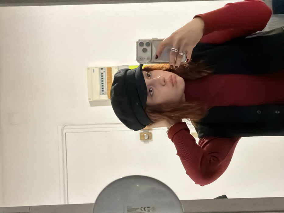 A woman takes a selfie in a mirror. She wears a black cap, a long-sleeved red shirt, and a black vest. She holds a smartphone in her right hand with her finger resting on the screen. Two silver rings adorn her fingers. She has light skin and red-brown hair. A white electrical panel is mounted on the wall behind her. The background includes a closed white door and a glimpse of what appears to be a sink.
