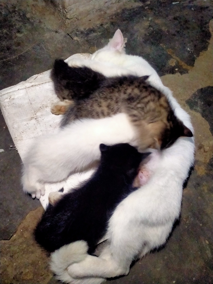 A white cat lies on a sack, nursing three kittens. One kitten is black, another is tabby, and the third is partially visible, appearing white. The kittens are nestled close to the mother cat, presumably feeding. The scene takes place on a rough surface, possibly concrete, under dim lighting. The focus is on the intimate moment of nurturing and care.