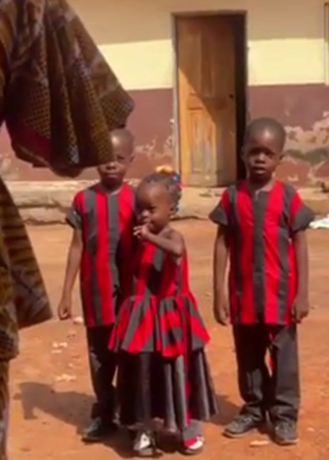 woman in a brown and yellow patterned dress talking to three young children standing together outside in front of a building. The children, two boys and a girl, are wearing matching outfits with vertical red and black stripes. The girl is in the center and wearing a dress, while the boys are on either side of her and wearing shirts and pants. The building behind them is painted with yellow and brown accents. The ground is reddish-brown. The woman's dress partially blocks the view of the children at times. The children seem to be posing for a photo or video, as the woman asks them to change their style.