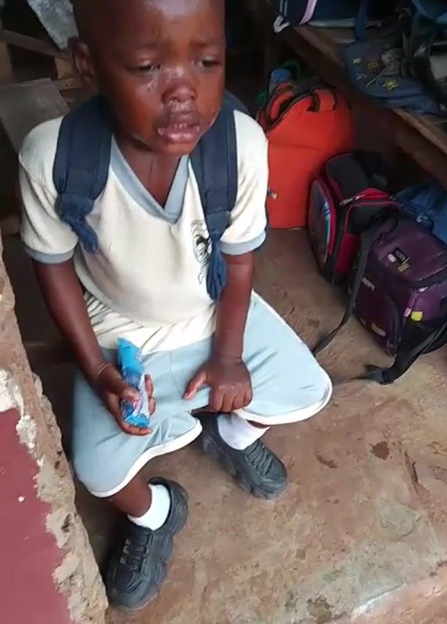A young boy in a school uniform sits on a low concrete ledge in what appears to be an informal classroom setting. He is crying, tears are visible on his face, and he has a small blue-and-white packaged treat in his hand. The boy is wearing a light-colored short-sleeved shirt with dark trim, light blue shorts, black shoes, and white socks. A dark backpack is strapped to his back. Behind him and to the right are multiple school bags of various colors stacked on a wooden shelf. A blurry figure is visible in the background near a window. The concrete ledge where the boy sits is chipped and worn.