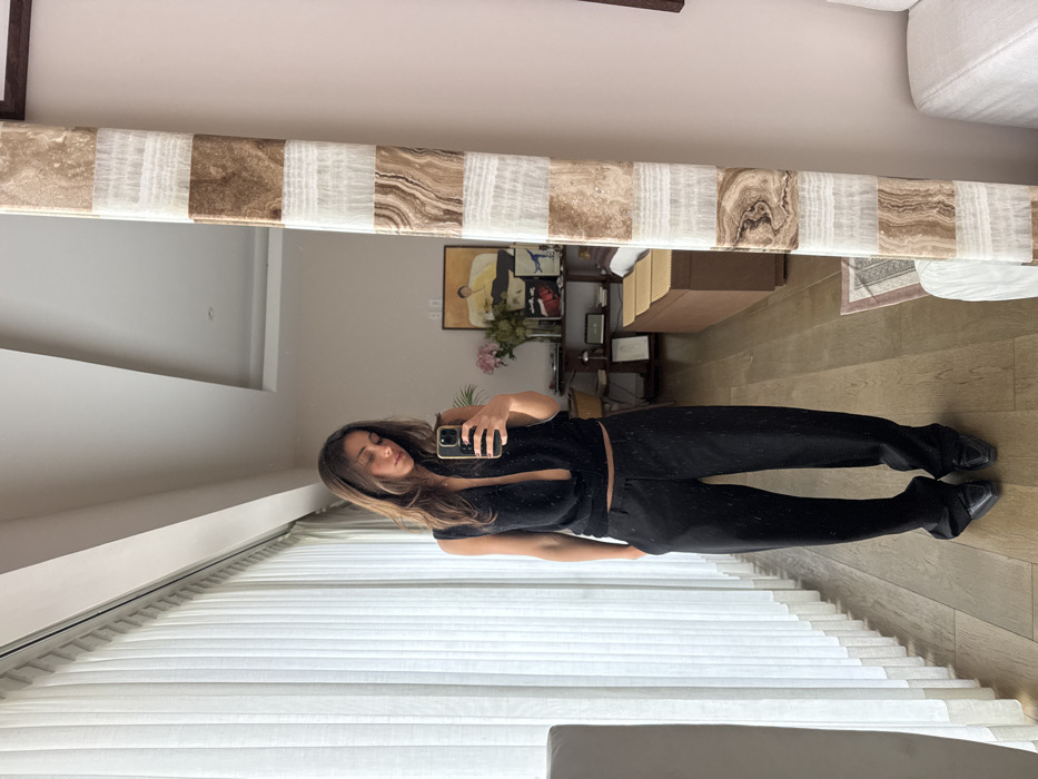 A mirror selfie shows a woman with long brown hair wearing a black outfit