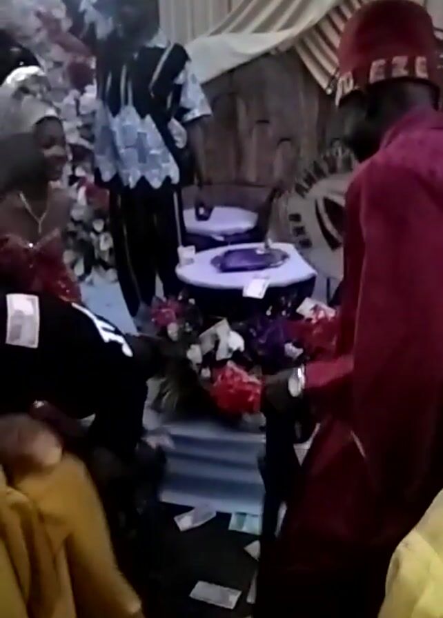The video appears to be taken from a low angle, looking upwards into a crowded space. Several people are visible, including individuals wearing a red hat and shirt, a black shirt with white writing, and a bright yellow shirt. There are various objects scattered on the floor, including what looks like a decorative white hat with a purple band, fabric remnants, and some floral arrangements. The environment seems somewhat enclosed with striped fabric hanging in the background. Music is playing, and the overall impression is that the people are gathered in this space.