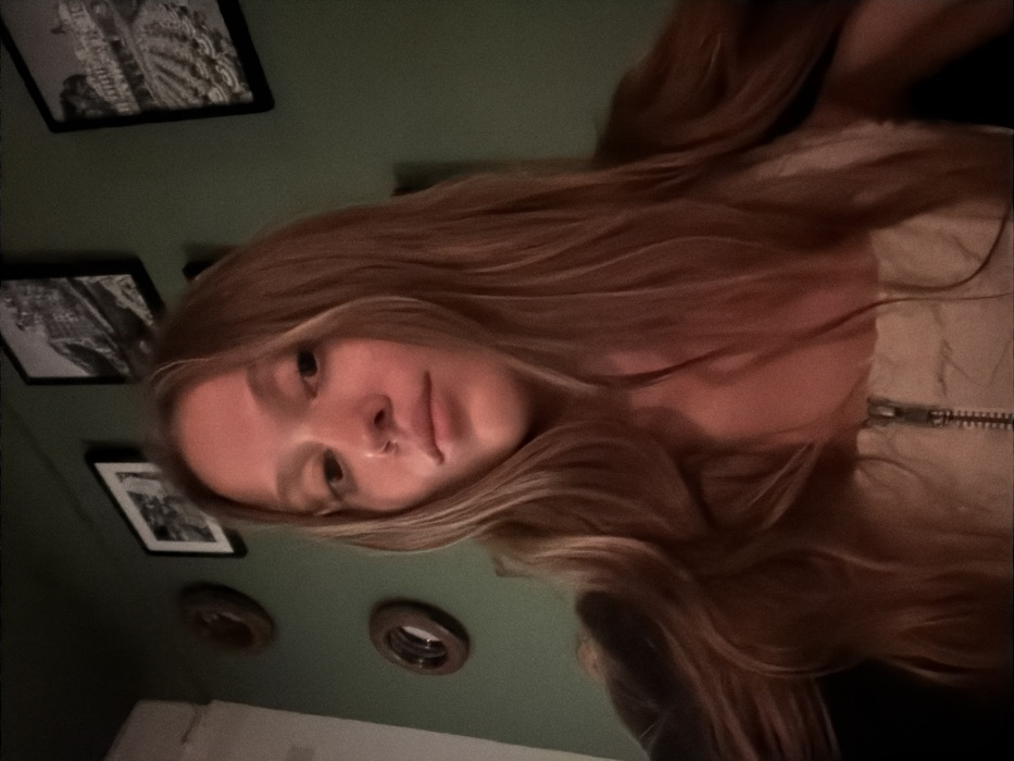 The scene depicts an indoor environment in Tibubeneng, Indonesia, featuring one female subject. The subject, a young adult female with long, wavy, light brown hair, is positioned centrally in a head-and-torso shot, facing directly towards the camera with a neutral expression. She is wearing a light-colored, possibly beige or cream, strapless top with a visible zipper closure down the front. The background consists of a dark green wall. Affixed to the wall are three framed black-and-white pictures, one depicting what appears to be a building or cityscape, and another an urban landscape with multiple structures. Two circular decorative objects, possibly small mirrors or plaques with dark frames, are visible on the left side of the wall. The lighting is warm and indirect, illuminating the subject's front and casting a soft glow. No specific actions or interactions are depicted beyond the subject posing for the photograph.