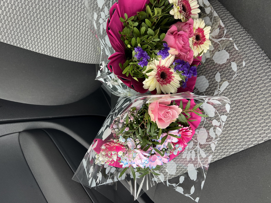 Two floral bouquets are positioned on a grey fabric car seat with a repeating patterned texture