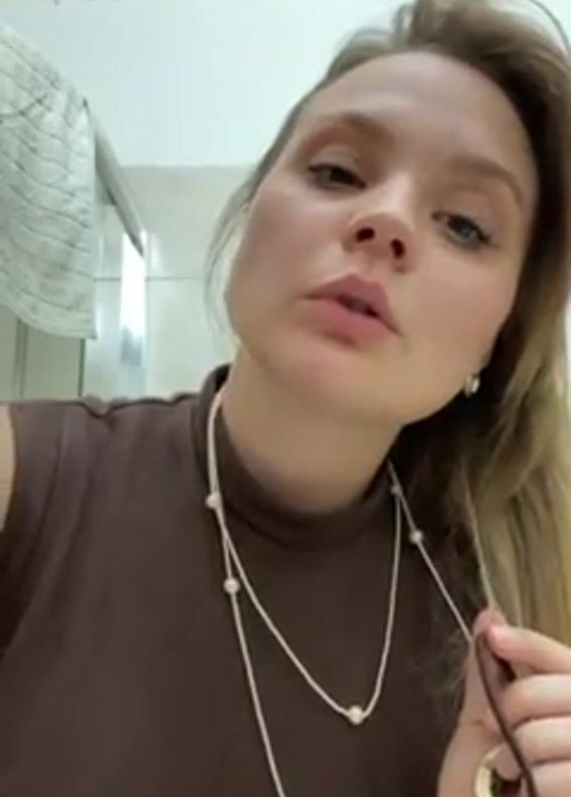 A fair-skinned woman with shoulder-length blonde hair is standing indoors, wearing a brown sleeveless turtleneck top and two necklaces