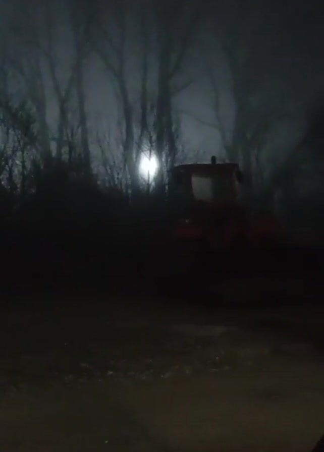 dark and foggy scene at night. A tractor is visible in the distance, obscured by trees and fog. A light source behind the tractor illuminates the surrounding area. The ground appears to be a dirt road.