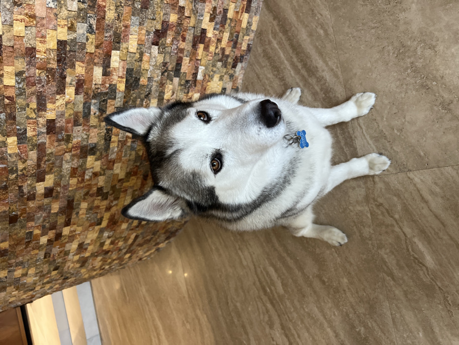 A husky dog lays on a shiny, light brown tile floor. The dog is white with gray markings. It looks up at the camera with its brown eyes. The dog has a blue bone-shaped tag on its collar. Behind the dog is a wall covered in small, rectangular tiles of various brown shades, arranged like bricks. The picture is taken from a high angle, looking down at the dog.