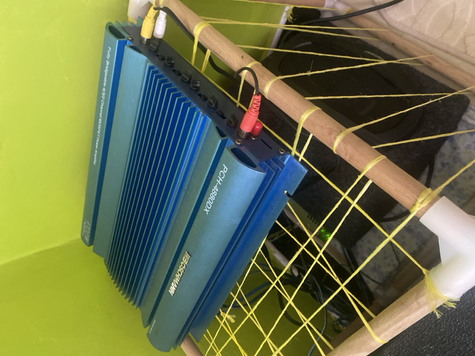An indoor scene in Nairobi, Kenya, displays electronic audio equipment. A blue Meschmann PCH-488DX Fully Bridgeable 4/2 Channel MOSFET Power Amplifier, featuring a ribbed heat sink, rests upon a makeshift, light-colored wooden frame. This frame is constructed from dowels or sticks joined by white plastic corner pieces, with a grid of yellow string forming a support surface. Red and yellow RCA cables are connected to the amplifier's input/output panel on its right side. Beneath the wooden frame, a black rectangular object, identified by a faintly visible "Pioneer" logo, appears to be a subwoofer or speaker enclosure. A small green indicator light is illuminated on the equipment situated underneath the string grid. The background consists of a solid, bright lime green wall. No individuals are visible, and no actions or interactions are depicted.