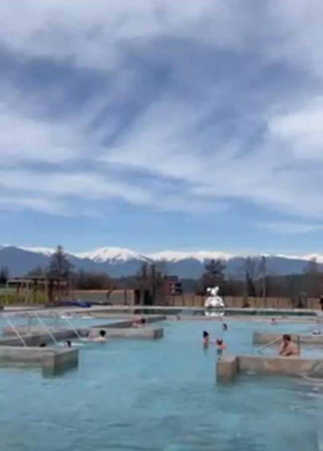 n outdoor swimming pool with people swimming in it. The pool has several sections, each separated by concrete borders. In the background, there are snow-capped mountains under a partly cloudy sky. There are trees and buildings visible on the horizon as well. There is a decorative statue by the pool.