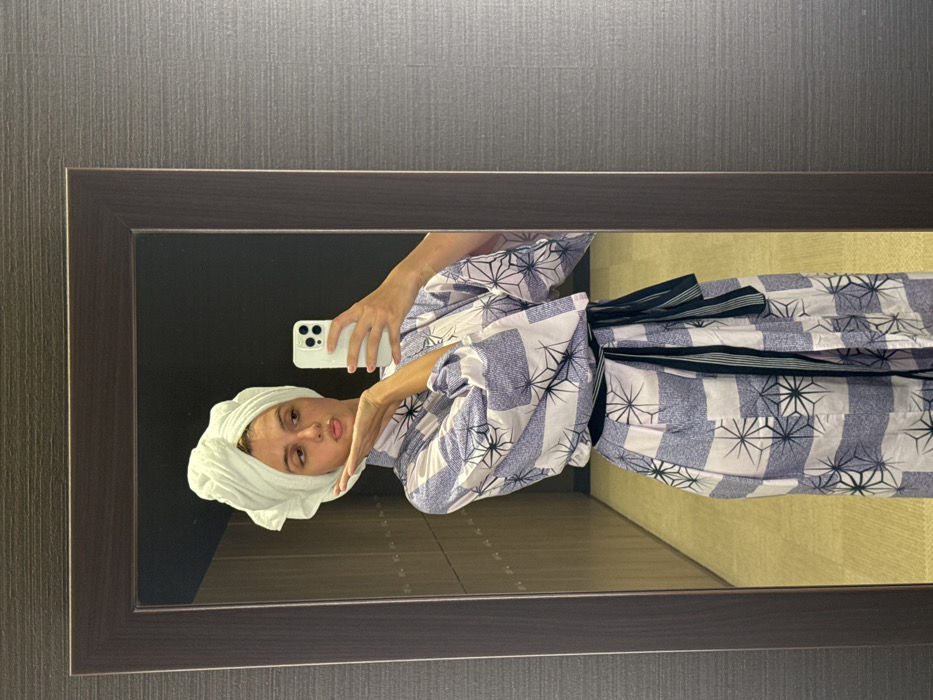 A female individual captures a mirror selfie in what appears to be a changing area or hotel corridor within a lodging establishment in Hakone, Japan