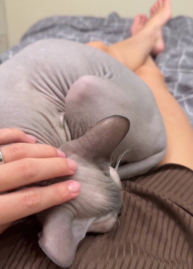 A close-up shot shows a hairless Sphynx cat sleeping curled up on a person's lap. The cat is light gray with visible wrinkles on its skin. A hand with manicured nails gently pets the cat on the head. The person is wearing a brown ribbed shirt or dress. The bed is visible in the background with a gray and white patterned sheet. Part of the person's legs and feet are also visible in the blurred background. A TV is partially visible on the wall.
