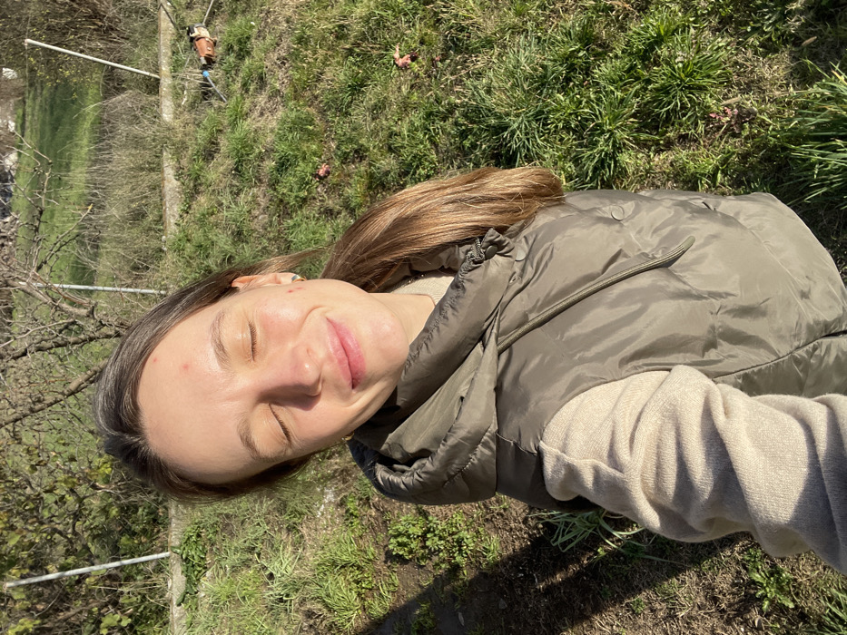 A single female individual is depicted outdoors in Mojanovići, Montenegro, captured from a high angle in what appears to be a selfie. The subject, with fair skin and brown hair pulled into a ponytail on the right, has her eyes closed and a slight smile on her lips, with her face illuminated by direct sunlight. Small reddish blemishes are visible on her forehead and right cheek. She wears a light beige long-sleeved top under a dark olive-green hooded puffer vest. The background consists of an unkempt grassy area with patches of bare soil and various weeds. In the mid-ground, scattered reddish-brown objects are visible on the grass. Further back, bare-branched deciduous trees and shrubs are present. A wire fence with light-colored poles runs through the left and center-rear of the frame. To the right in the background, a piece of red and black machinery, possibly a gasoline-powered engine or pump, lies on the grass near a white vertical pipe.